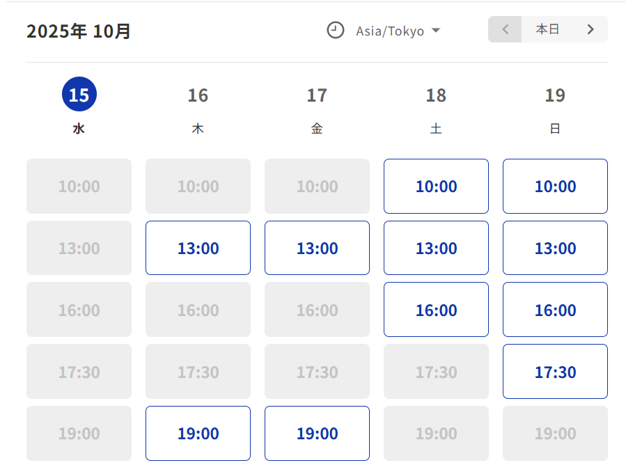 無料体験の申し込みフォームには希望日と時間を選びますが、当日や翌日の予約はできないようです。また、一覧で空いている日が出ていないのでそこはわかりづらいポイントです。